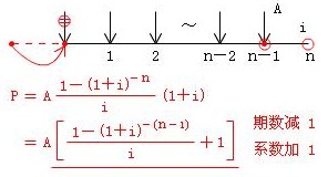 方法一:若向前延長(zhǎng)一期,起點(diǎn)為-1,則可看出由(-1~n-1)剛好是n個(gè)期間,套用普通年金現(xiàn)值的計(jì)算公式,得出來的是在第-1期期末的數(shù)值A(chǔ)(P/A,i,n),為了得出第0點(diǎn)的數(shù)值,P=A(P/A,i,n)(1+i)
