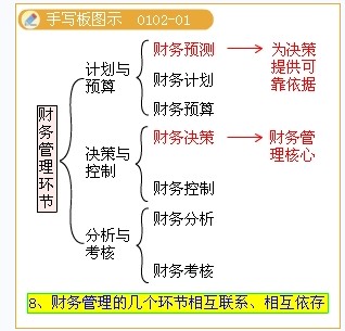 計(jì)劃與預(yù)算【財(cái)務(wù)預(yù)測(cè)、財(cái)務(wù)計(jì)劃、財(cái)務(wù)預(yù)算(有定性預(yù)測(cè)和定量預(yù)測(cè),第2章)】;決策與控制【財(cái)務(wù)決策、財(cái)務(wù)控制(第6章)】;分析與考核【財(cái)務(wù)分析、財(cái)務(wù)考核(第8章)】