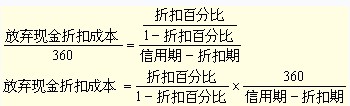 如果放棄現(xiàn)金折扣(即不在折扣期內(nèi)付款)則要承擔(dān)的借款成本。其實,放棄現(xiàn)金折扣的信用成本計算就是一個計算"借款"年利率的問題,(信用期-折扣期)表示的是"實際借款天數(shù)"。
