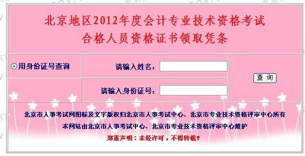 北京地區(qū)2012年度會(huì)計(jì)專(zhuān)業(yè)技術(shù)資格考試合格人員資格證書(shū)領(lǐng)取憑條開(kāi)始查詢(xún),考生可以通過(guò)下面鏈接進(jìn)入頁(yè)面。