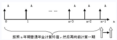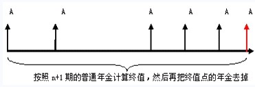 ?、傧葘⑵淇闯善胀杲?,套用普通年金終值的計(jì)算公式,計(jì)算終值,得出來(lái)的是在最后一個(gè)A位置上的數(shù)值,即第n-1期期末的數(shù)值,再將其向前調(diào)整一期,得出要求的第n期期末的終值,即: