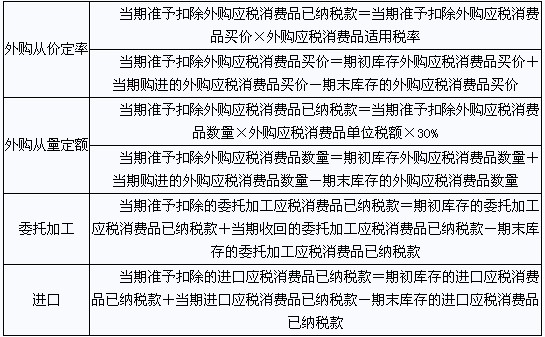 2.外購、委托加工和進口的應稅消費品,用于連續(xù)生產(chǎn)應稅消費品的,準予從消費稅應納稅額中扣除原料已納消費稅稅款,按照不同行為計算公式分別如下: