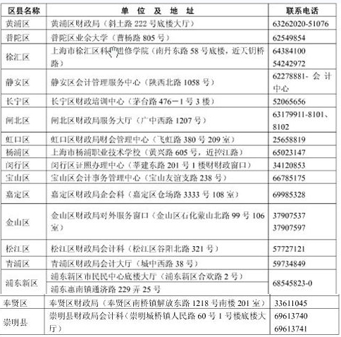 (一)領(lǐng)取初級(jí)資格證書(shū)確認(rèn)所屬區(qū)縣財(cái)政局,請(qǐng)查詢(xún)成績(jī)單上的發(fā)證編號(hào),如1310-0451-2-00427,代碼為:0451徐匯區(qū)、0551長(zhǎng)寧區(qū)、0651靜安區(qū)、0751普陀區(qū)、0851閘北區(qū)、0951虹口區(qū)、1051楊浦區(qū)、1251閔行區(qū)、1351寶山區(qū)、1451浦東新區(qū)(不含惠南)、1951黃浦區(qū)、2251嘉定區(qū)、2551浦東新區(qū)(惠南)、2651奉賢區(qū)、2751松江區(qū)、2851金山區(qū)、2951青浦區(qū)、3051崇明縣。