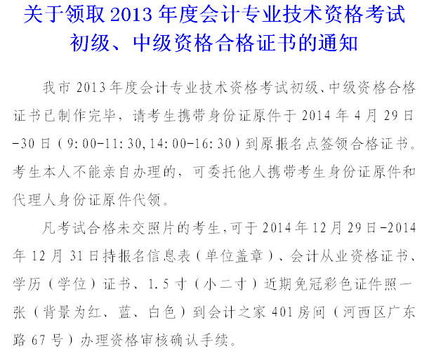 關(guān)于領(lǐng)取2013年度會(huì)計(jì)專業(yè)技術(shù)資格考試初級(jí)、中級(jí)資格合格證書的通知