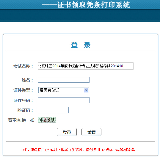 北京2014年中級會計職稱考試證書領(lǐng)取憑條打印系統(tǒng)