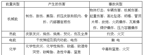 能量在人類的生產(chǎn)、生活中是不可缺少的,人類利用各種形式的能量做功以實現(xiàn)預(yù)定的目的。人類在利用能量的時候必須采取措施控制能量,使能量按照人們的意圖產(chǎn)生、轉(zhuǎn)換和做功。從能量在系統(tǒng)中流動的角度,應(yīng)該控制能量按照人們規(guī)定的能量流通渠道流動。如果由于某種原因失去了對能量控制,就會發(fā)生能量違背人的意愿的意外釋放或逸出,使進行中的活動中而發(fā)生事故。如果事故時意外釋放的能量作用于人體,并且能量的作用超人體的承受能力,則將造成人員傷害;如果意外釋放的能量作用于設(shè)備、建筑物、物體等,并且能量的作用超過它們的抵抗能力,則將造成設(shè)備、建筑物、物體的損壞。
