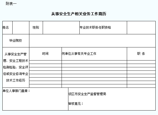 (3)符合免試條件的還須提供高級(jí)專業(yè)技術(shù)職務(wù)任職資格證書(shū)原件、復(fù)印件和由所在單位人事部門出具的從事安全生產(chǎn)相關(guān)業(yè)務(wù)工作簡(jiǎn)歷證明。