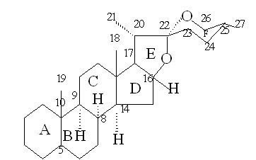 1、皂苷元結(jié)構(gòu)特點(diǎn):皂苷元由27個(gè)碳組成,共有A.B.C.D.E和F六個(gè)環(huán).其中E和F以螺縮酮的形式連接,共同組成螺旋甾烷.
