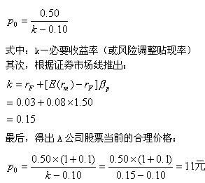 例4:A公司今年 每股股息為0.50元,預(yù)期今后每股股息將以每個10%的速度穩(wěn)定增長。當(dāng)前的無風(fēng)險利率為0.03,市場組合的風(fēng)險溢價0.08,A公司股票的β值為1.50。求A公司股票當(dāng)前的合理價格P0是多少?
