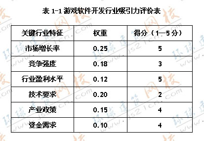 為了降低企業(yè)的市場(chǎng)風(fēng)險(xiǎn),X公司擬實(shí)施多元化經(jīng)營(yíng),考慮進(jìn)入游戲軟件開發(fā)行業(yè)。為此,X公司委托Y咨詢公司分析了該行業(yè)的吸引力,如表1-1所示。