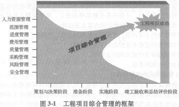 圖3―1說明了工程項目綜合管理的框架。圖中橫坐標表示工程項目建設(shè)周期的各階段工作任務(wù),縱坐標表示各種項目管理目標,工程項目綜合管理用圖中箭頭表示,箭頭隨著工程項目建設(shè)周期演化而更加集中。工程項目綜合管理將所有這些要素結(jié)合在一起,直到成功地完成工程項目。