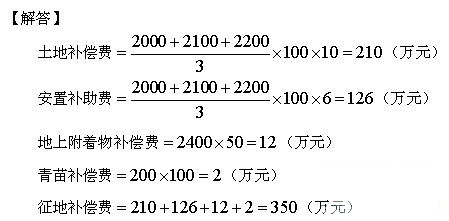 【例題9】某建設(shè)項目,需要征用耕地100畝,該耕地被征用前三年平均每畝年產(chǎn)值分別為2000元、2100元和2200元,土地補償費標準為前三年平均年產(chǎn)值的10倍;被征用單位人均占有耕地1畝,每個需要安置的農(nóng)業(yè)人口的安置補助費標準為該耕地被征用前三年平均年產(chǎn)值的6倍;地上附著物共有樹木2400棵,補償標準為50元/棵,青苗補償標準為200元/畝,則該征地補償費為( )。