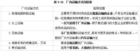 根據(jù)廠外運(yùn)進(jìn)、廠內(nèi)運(yùn)出的實(shí)物量、物態(tài)特性、包裝方式、產(chǎn)地、運(yùn)距、可能運(yùn)輸方式,通過(guò)經(jīng)濟(jì)技術(shù)比較,確定并推薦運(yùn)輸方式,編制廠外運(yùn)輸量一覽表(教材108頁(yè)見(jiàn)表3-14)。