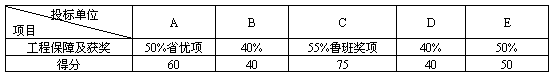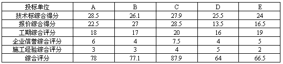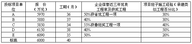 6.企業(yè)信譽(yù)評(píng)分原則是:企業(yè)近三年工程優(yōu)良率為準(zhǔn),100%為滿分,如有國家級(jí)獲獎(jiǎng)工程,每項(xiàng)加20分,如有省市獎(jiǎng)優(yōu)良工程每項(xiàng)加10分;項(xiàng)目班子施工經(jīng)驗(yàn)評(píng)分原則是以近三年來承建類似工程與承建總工程百分比計(jì)算100%為100分。下面是五家投標(biāo)單位投標(biāo)報(bào)表情況: