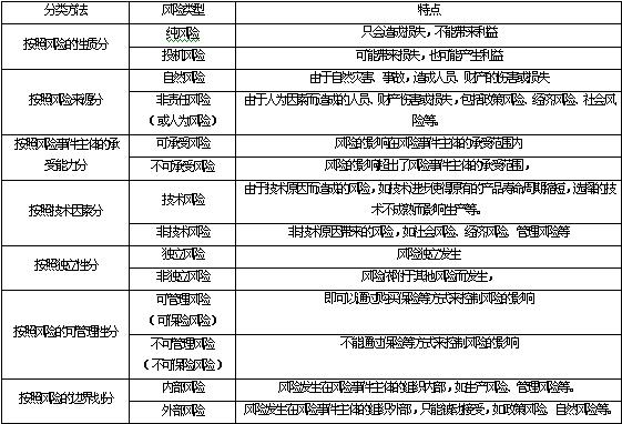 ③按性質(zhì)分:政治風(fēng)險(xiǎn)、經(jīng)濟(jì)風(fēng)險(xiǎn)、財(cái)務(wù)風(fēng)險(xiǎn)、信用風(fēng)險(xiǎn)、技術(shù)風(fēng)險(xiǎn)和社會(huì)風(fēng)險(xiǎn)等;