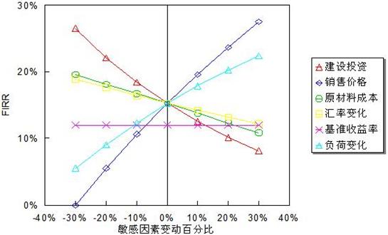 根據(jù)敏感性分析表中的數(shù)值可以繪制敏感性分析圖,橫軸為不確定因素變化率,縱軸為項(xiàng)目效益指標(biāo)。