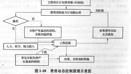 工程項(xiàng)目一次性、固定性、諸多因素帶有不確定性等特點(diǎn)決定了其過(guò)程控制的動(dòng)態(tài)特征,必須在項(xiàng)目實(shí)施過(guò)程中根據(jù)情況的變化進(jìn)行項(xiàng)目目標(biāo)的動(dòng)態(tài)控制。動(dòng)態(tài)控制廣泛應(yīng)用于工程項(xiàng)目的進(jìn)度控制、費(fèi)用控制、質(zhì)量控制等過(guò)程中。以費(fèi)用控制為例,其基本原理如圖1-10所示。工程項(xiàng)目動(dòng)態(tài)控制的糾偏措施主要有:組織措施、管理措施、經(jīng)濟(jì)措施、技術(shù)措施等。