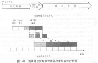 由業(yè)主委托的CM方式項目負(fù)責(zé)人(ConstructionManager,以下簡稱CM經(jīng)理)與設(shè)計單位、咨詢工程師組成一個聯(lián)合小組,共同負(fù)責(zé)組織和管理工程的規(guī)劃、設(shè)計和施工。在項目的總體規(guī)劃、布局和設(shè)計時,要考慮到控制項目的總投資,在主體設(shè)計方案確定后,完成一部分工程的設(shè)計,即對這一部分工程進行招標(biāo),發(fā)包給一家承包商施工,由業(yè)主直接與承包商簽訂施工承包合同。傳統(tǒng)的連續(xù)建設(shè)模式的招標(biāo)發(fā)包方式與階段發(fā)包方式的比較如圖1―12所示。