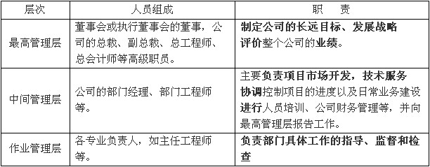 工程咨詢單位的管理層次分為三層,他們各司其責,具體見表3-1。