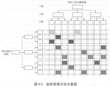 工作分解結構將項目依次分解成較小的項目單元,直到滿足項目控制需要的最低層次,這就形成了一種層次化的“樹”狀結構。這一樹狀結構將項目合同中規(guī)定的全部工作分解為便于管理的獨立單元,并將完成這些單元工作的責任賦予相應的具體部門和人員,從而在項目資源與項目工作之間建立了一種明確的目標責任關系,這就形成了一種職能責任矩陣。如圖4-2所示。